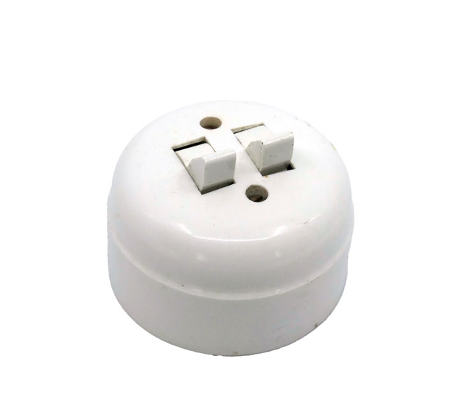 Hvit lysbryter med knapp som spretter tilbake til samme posisjon.