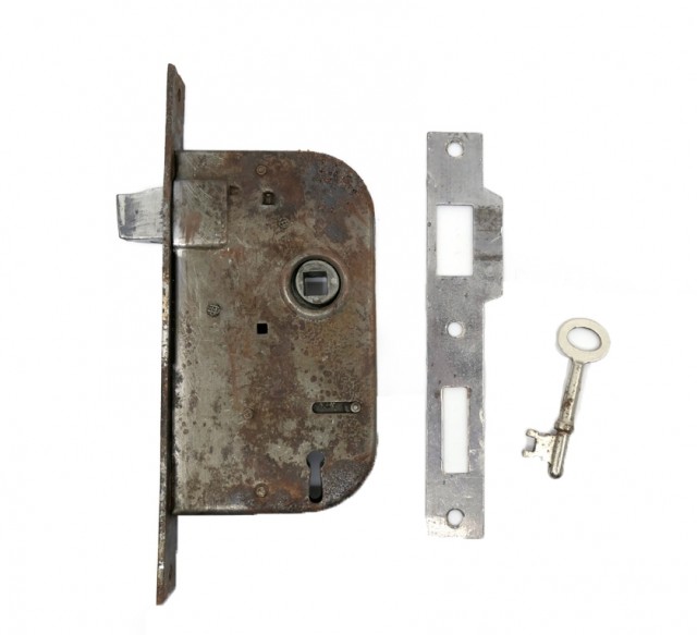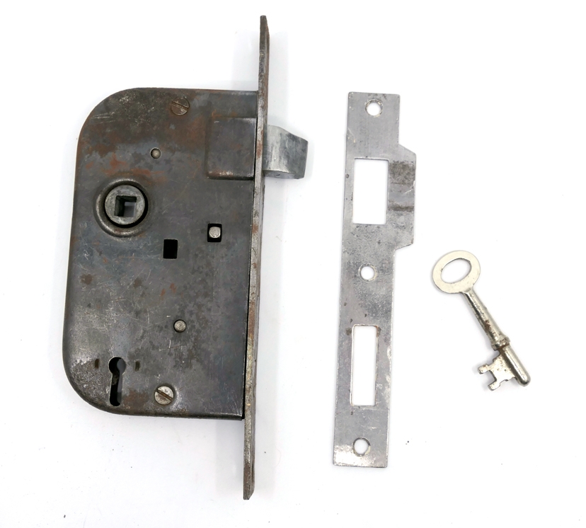 Gammel låsekasse med sluttblikk og nøkkel. Til høyrehengslet dør.