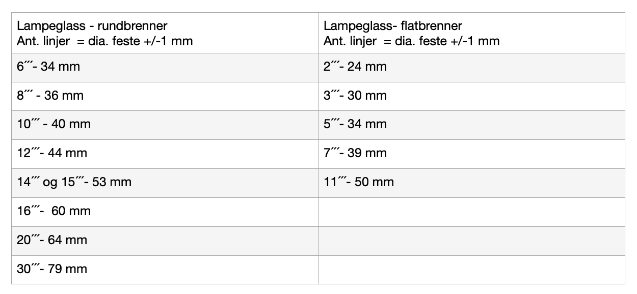 Her finner du gamle, antikke lampeglass i ulike størrelser til både flatbrenner og rundbrenner. Se tabell under for mål på lampeglass.
