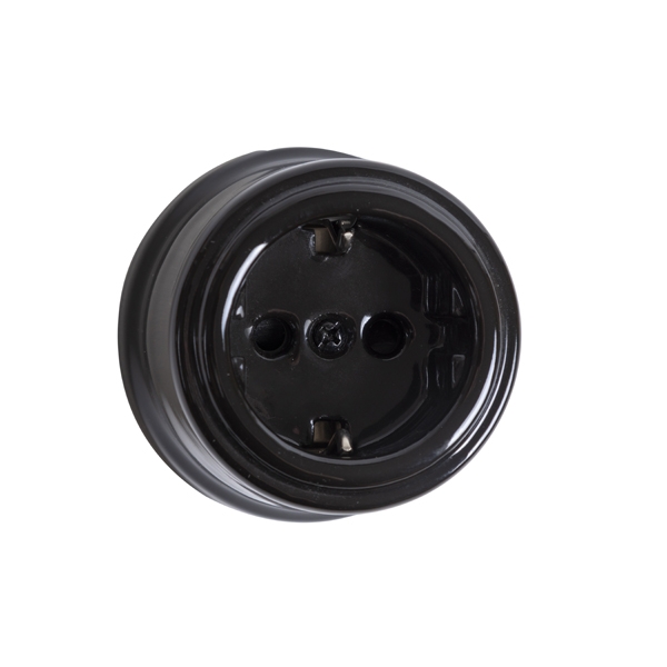Klassisk utenpåliggende stikkontakt i svart porselen med et utseende som var vanlig i Europa på første del av 1900-tallet.