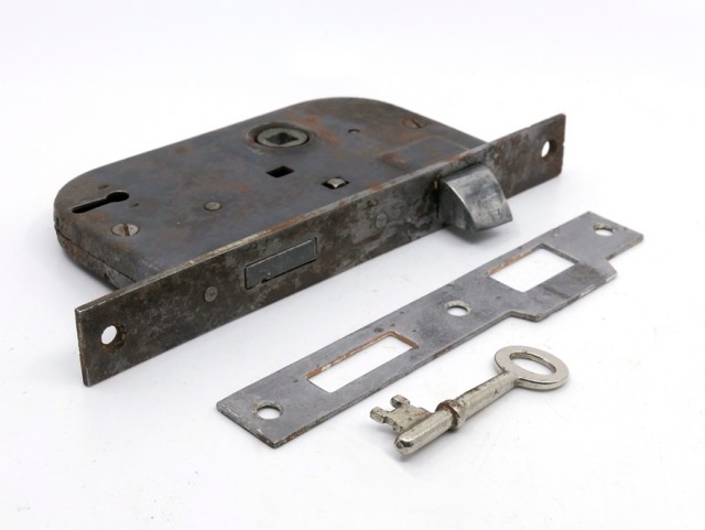 Gammel låsekasse med sluttblikk og nøkkel. Til høyrehengslet dør.
